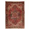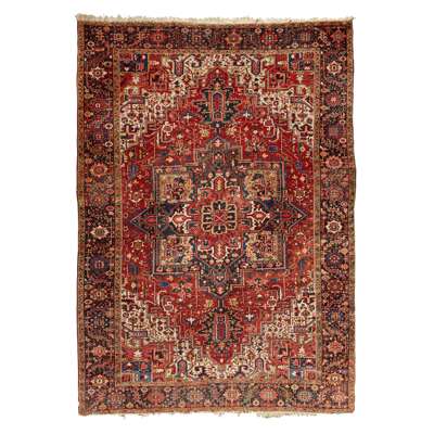 the red field with indigo and salmon pink star medallion, ivory, pink and indigo spandrels, within indigo rosette and vine border