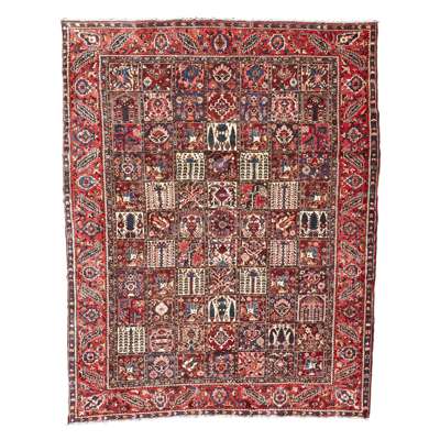 the polychrome field with allover square foliate lattice pattern, within red palmette and vine border