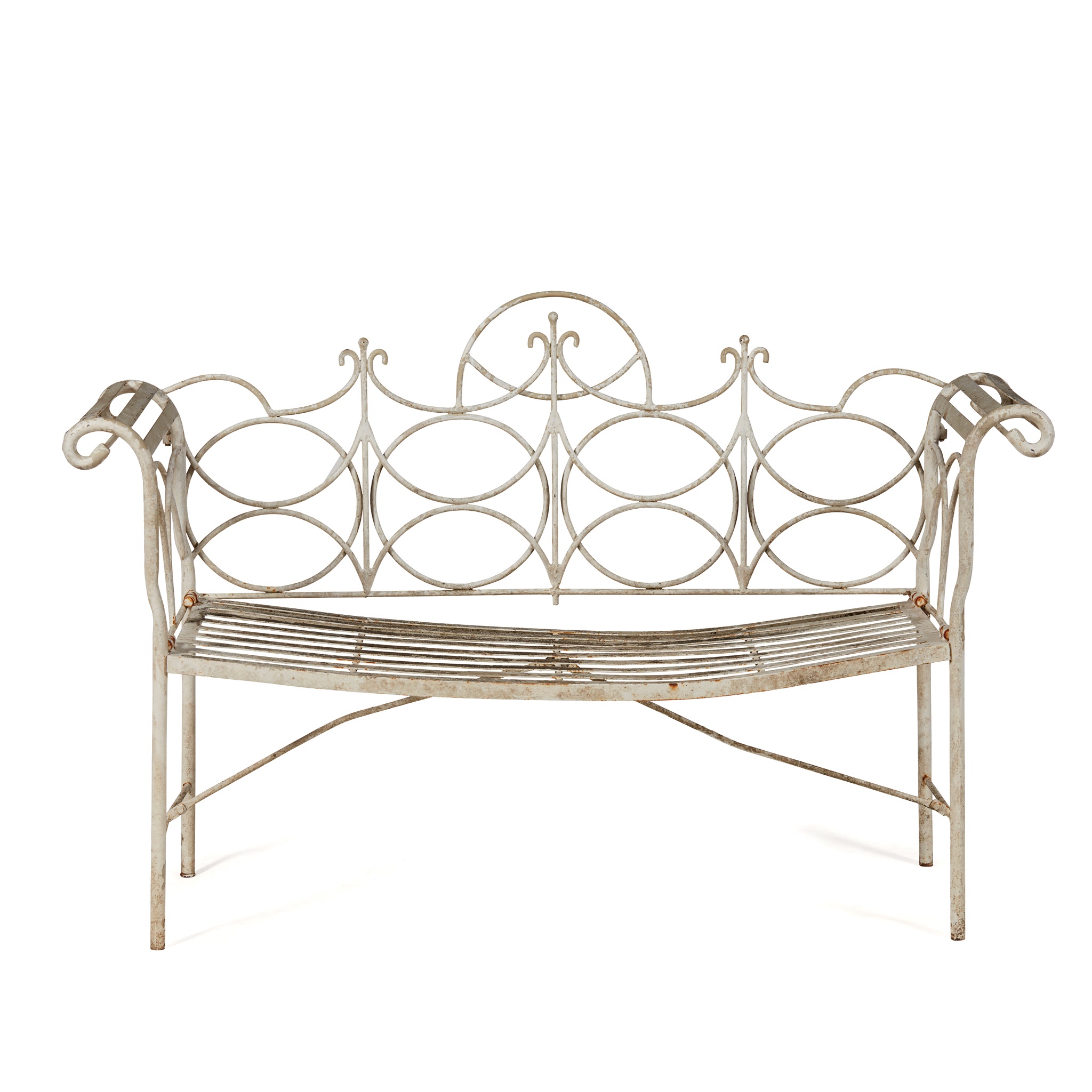 with an interlaced back and scrolling arms above a slat seat and straight legs