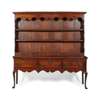 the moulded cornice above a shaped frieze and two shelves and six short drawers; the base with three drawers and a shaped apron, raised on cabriole legs with pad feet