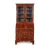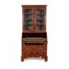 the top with a straight moulded cornice above a pair of glazed doors enclosing shelves with candleslides below; the base with a slant front opening to an arrangement of drawers and pigeon holes and a well, over two short graduated drawers and two further long drawers, all with featherbanding, raised on bracket feet