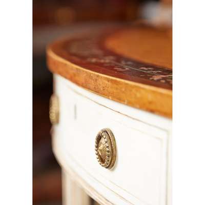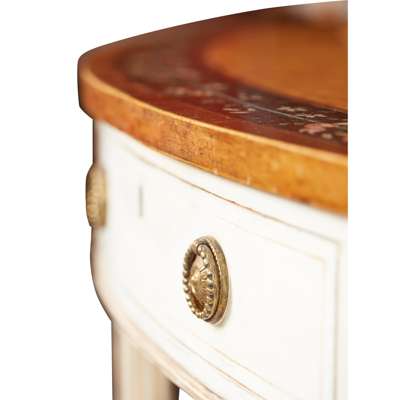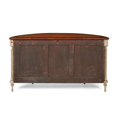 FINE GEORGE III SATINWOOD, KINGWOOD, PARCEL GILT AND GREY PAINTED DEMILUNE COMMODE