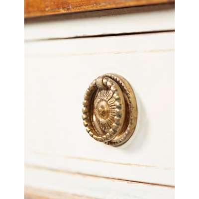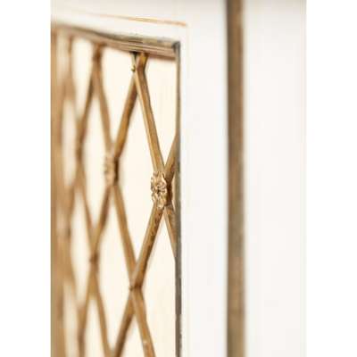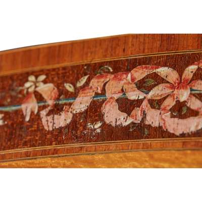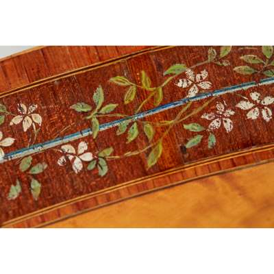 the crossbanded top with painted flower garland banding, above four short frieze drawers above cupboard doors with brass grille inserts lined with cream pleated silk, and divided by fluted columns, raised on tapered feet