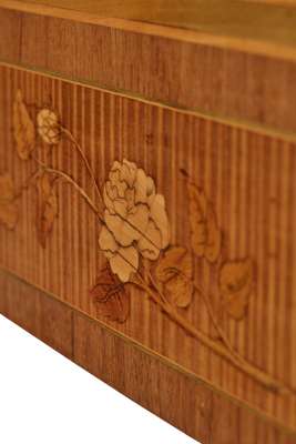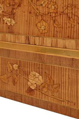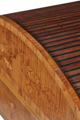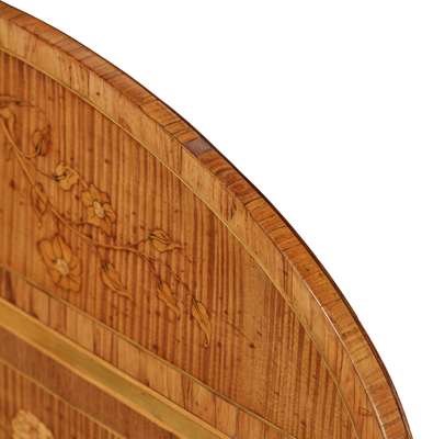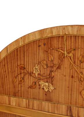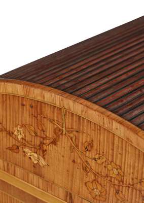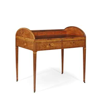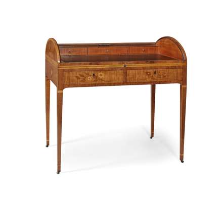 GEORGE III SYCAMORE, AMARANTH, AND FLORAL MARQUETRY TAMBOUR-TOP WRITING TABLE, AFTER A DESIGN BY THOMAS SHEARER