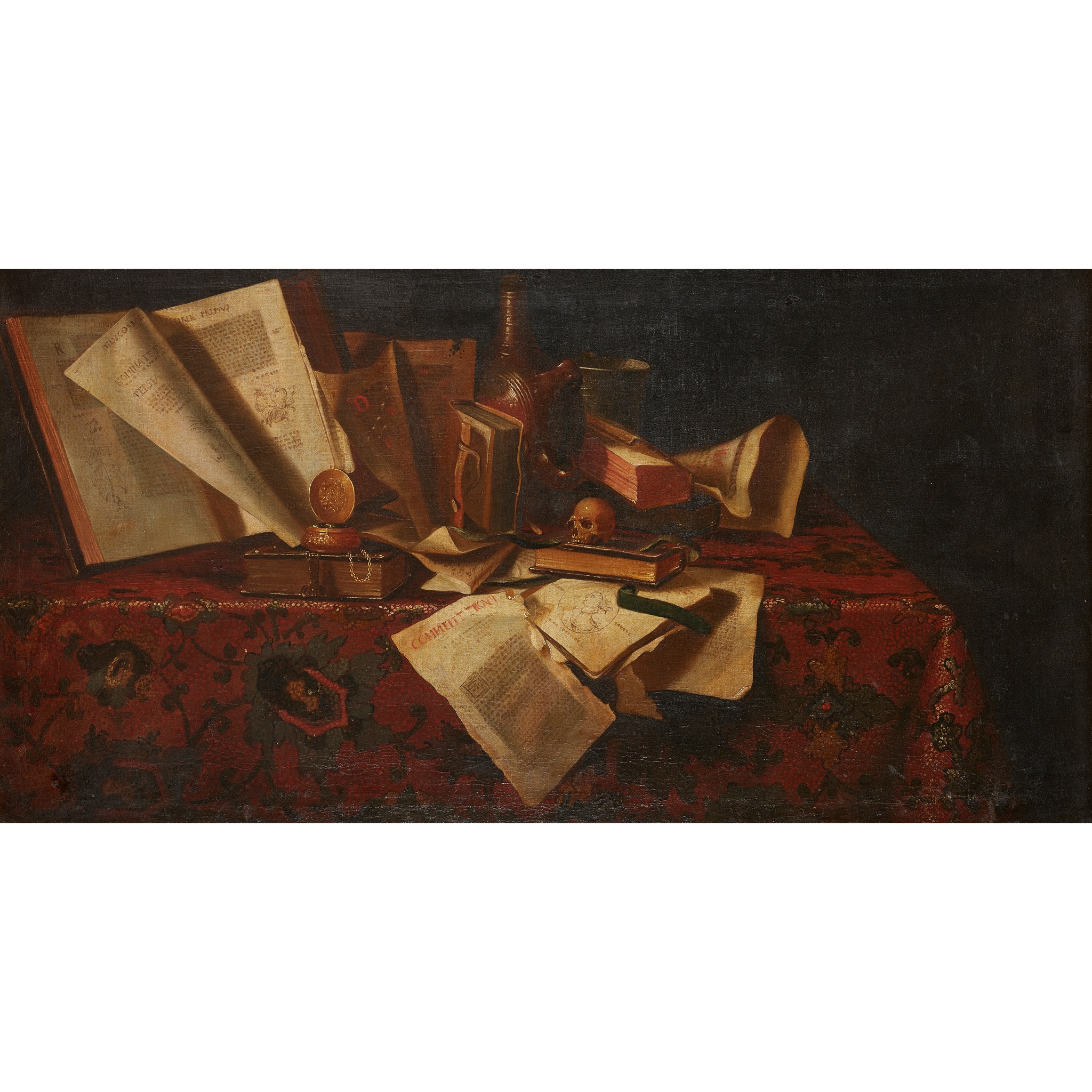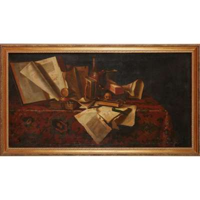 A STILL LIFE OF BOOKS AND OBJETS ON A CARPET TOPPED TABLE