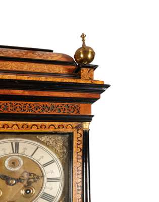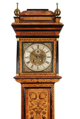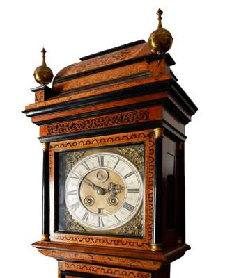 the silvered brass 12in. square dial with a Roman numeral chapter with five-second markers, twin winding holes, date aperture, and subsidiary seconds dial, with cherub and crown pierced finials in caddy top hood with ebony columns, above a long trunk door with a brass banded lenticle and boxwood lined marquetry panels, on a base with a central marquetry panel and raised on bun feet; the month-going five pillar movement with five trains, anchor escapement, and outside countwheel hour strike on a bell