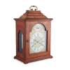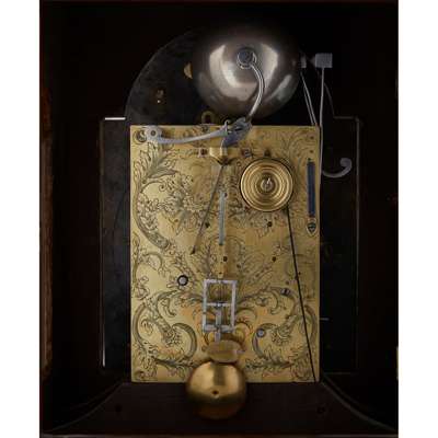 the inverted bell case with an arched brass dial with false pendulum aperture and Roman number chapters, the foliate engraved backplate enclosing the eight day movement with three bell chime and pull repeat