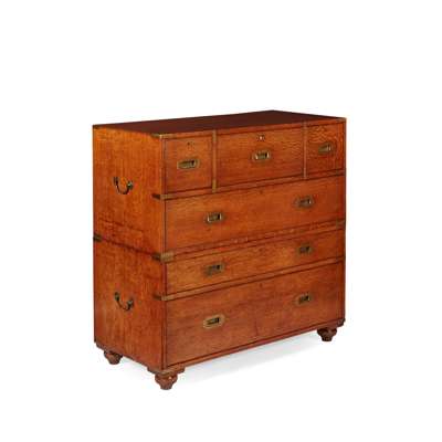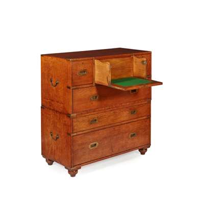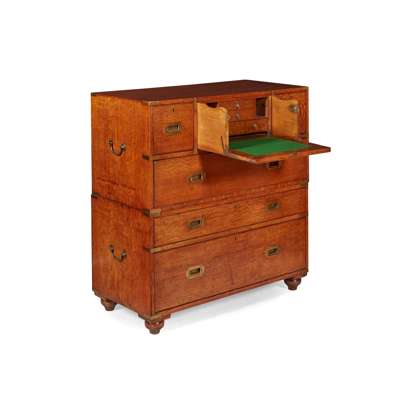 OAK AND BRASS MOUNTED CAMPAIGN SECRETAIRE CHEST OF DRAWERS