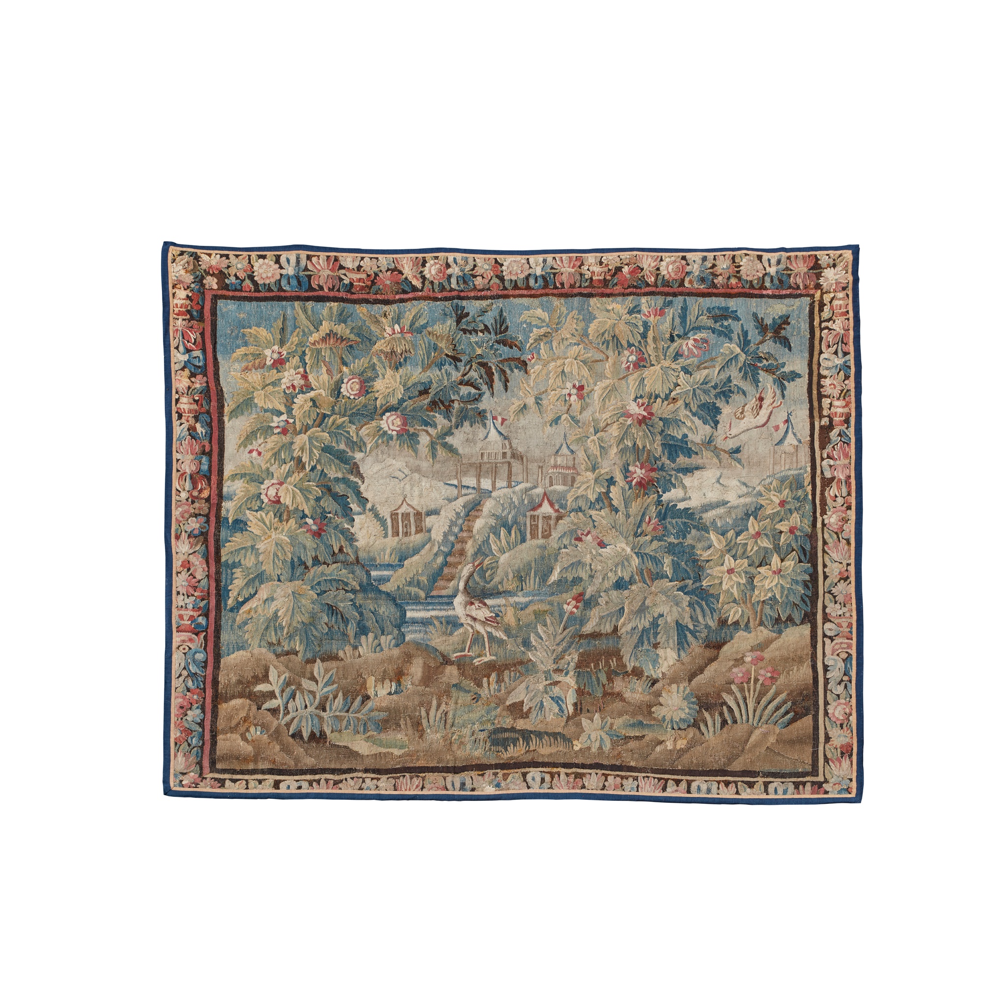 depicting a heron and other birds amidst trees by water, with tented pavilions in the background, within brown foliate border
