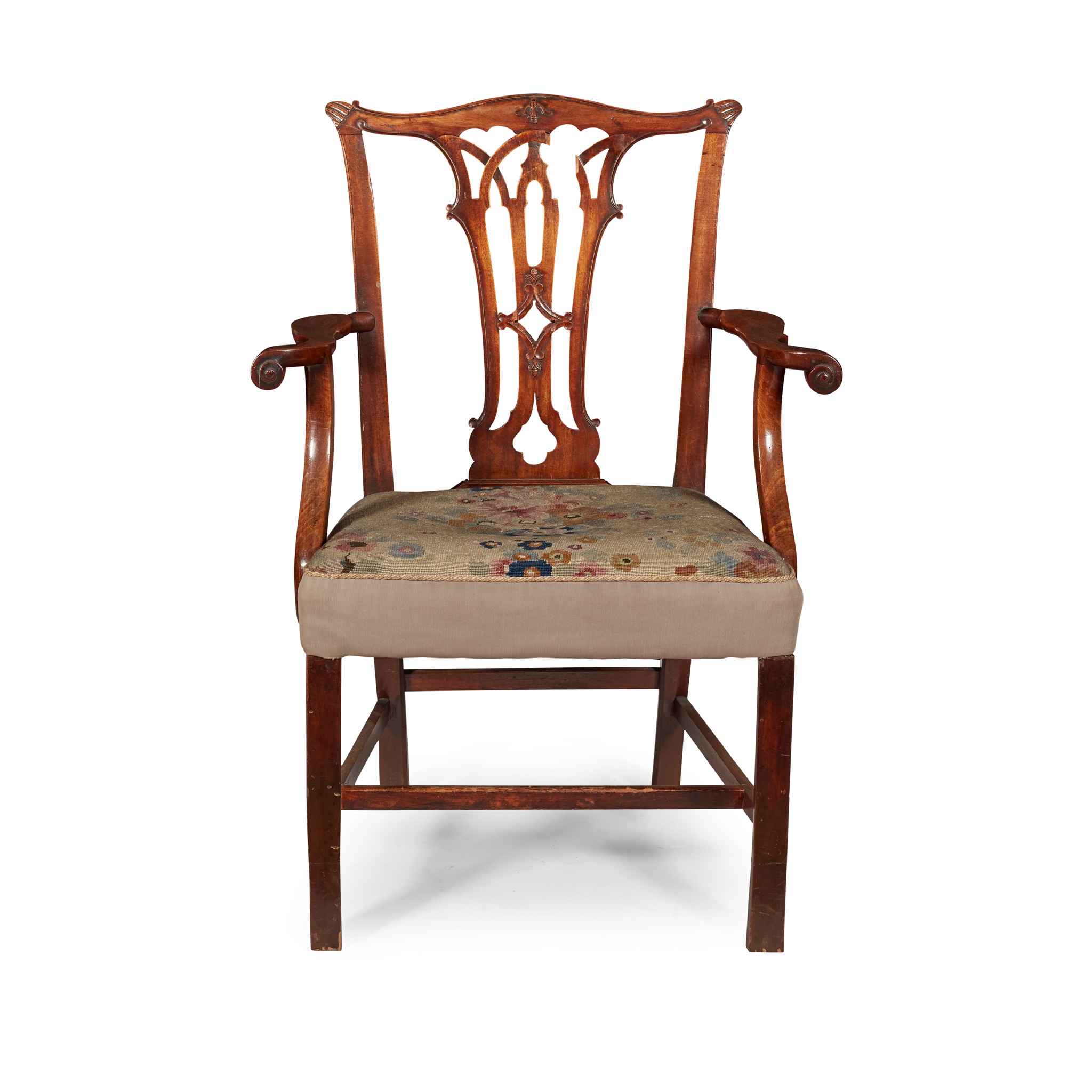 GEORGE III MAHOGANY AND NEEDLEWORK OPEN ARMCHAIR