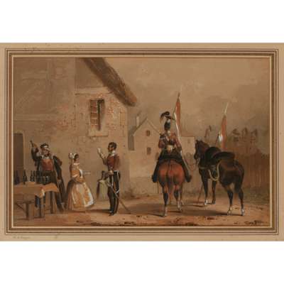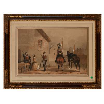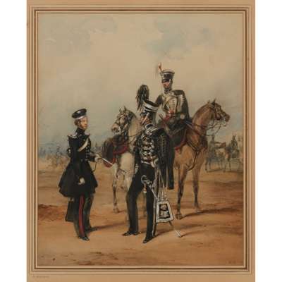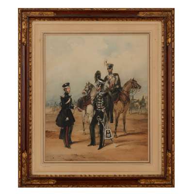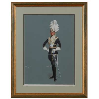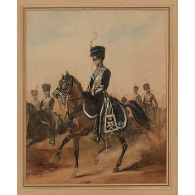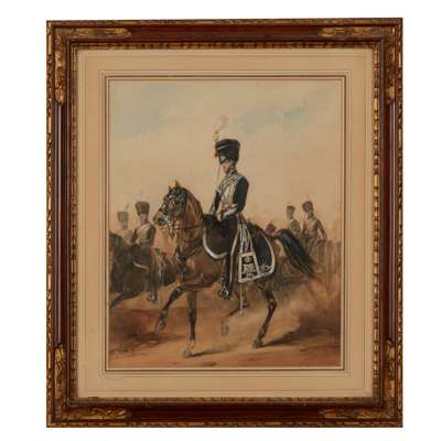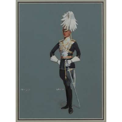 signed HM, 29cm high, 23cm wide (including frame); together with MILITARY WATERCOLOUR BY M.A.HAYES, no signature visible, 19.5cm high, 19cm wide (including frame); and a GOUACHE OF THE 17th DUKE OF CAMBRIDGE OWN LANCER
