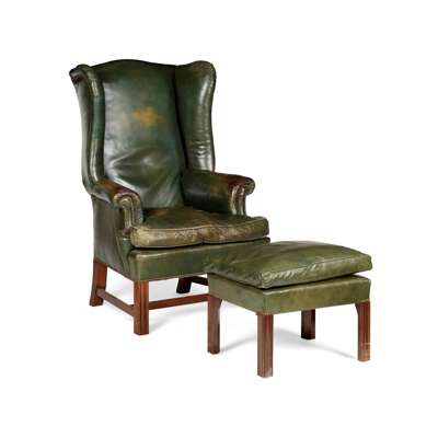 GEORGIAN STYLE MAHOGANY GREEN LEATHER UPHOLSTERED WING ARMCHAIR AND FOOTSTOOL, BY WHYTOCK & REID