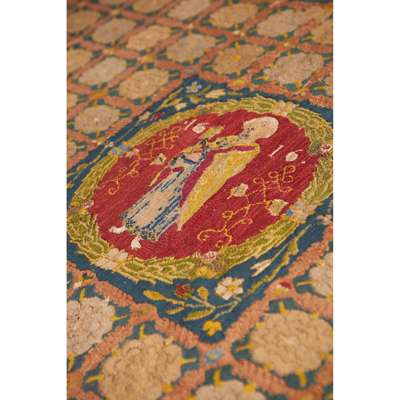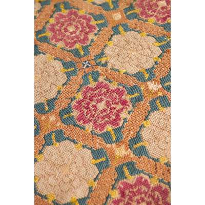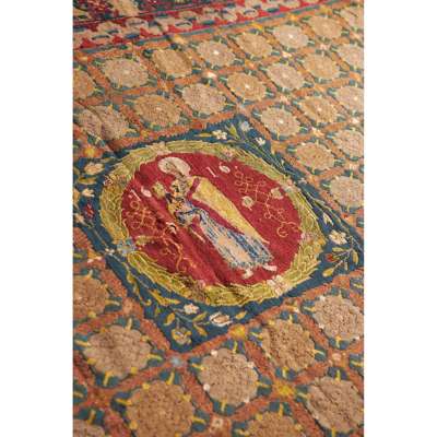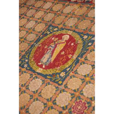 the central panel with a saint within a laurel wreath, in a trellis field of roses enclosed by a geometric border interspersed with various flower heads