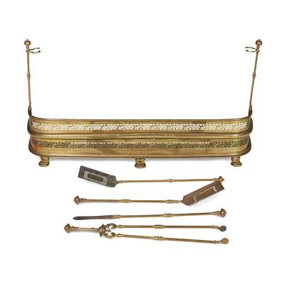TWO SETS OF BRASS FIRE TOOLS AND A BRASS FENDER
