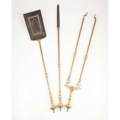 each set comprising a poker, a pair of tongs, and a shovel; together with a further BRASS SHOVEL