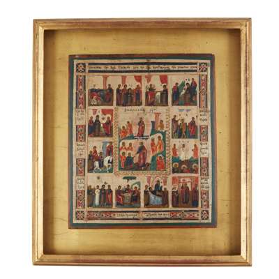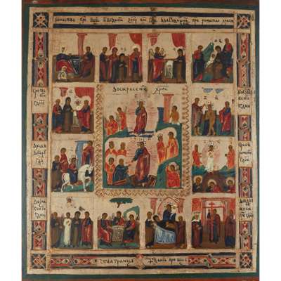 RUSSIAN ICON OF THE RESURRECTION AND DESCENT INTO HELL, SURROUNDED BY TWELVE FESTIVALS