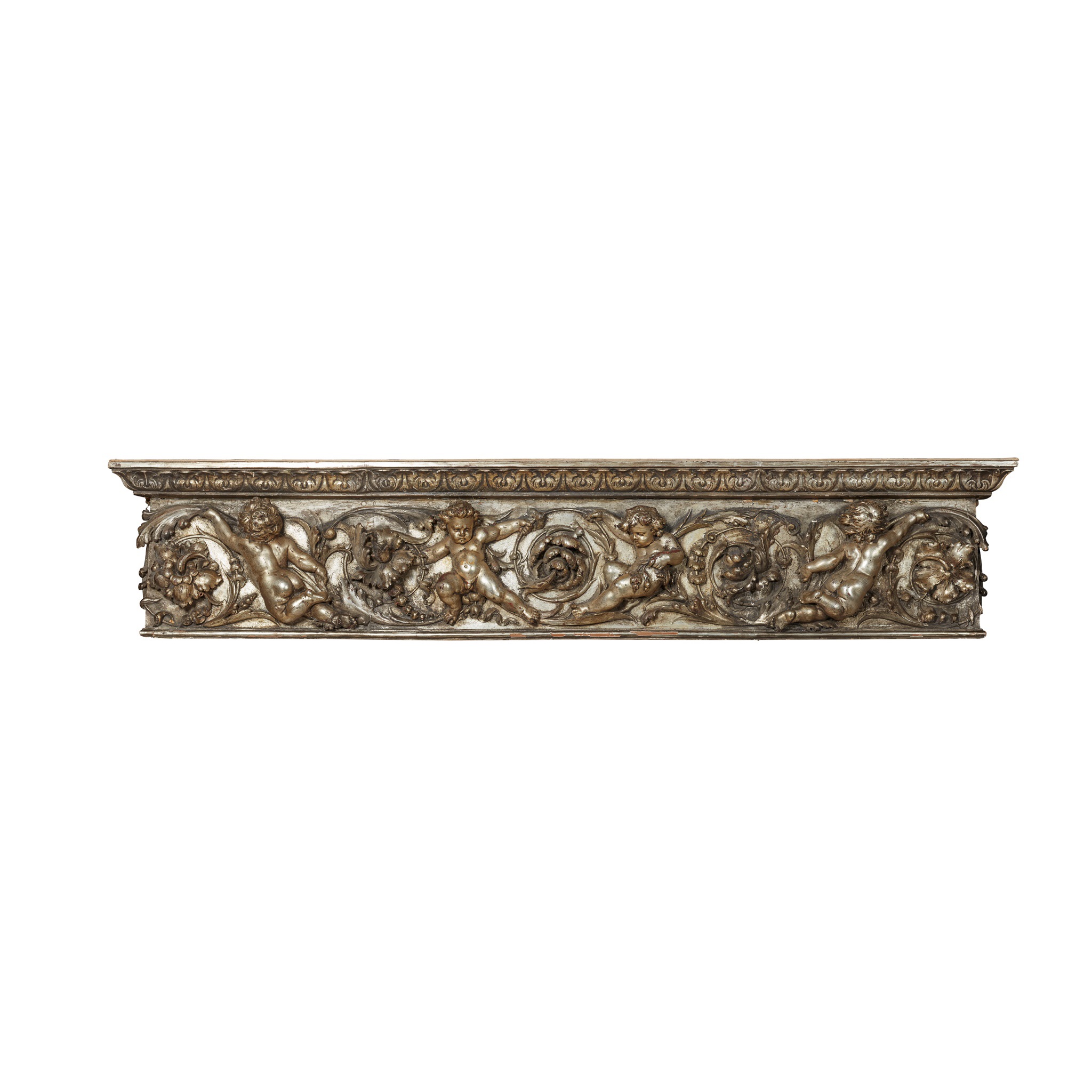 the frieze carved in deep relief with putti and flowers