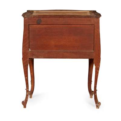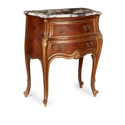 FRENCH LOUIS XV STYLE BRÈCHE VIOLETTE MARBLE TOPPED KINGWOOD PARCEL GILT COMMODE, H. LEMOINE, PARIS