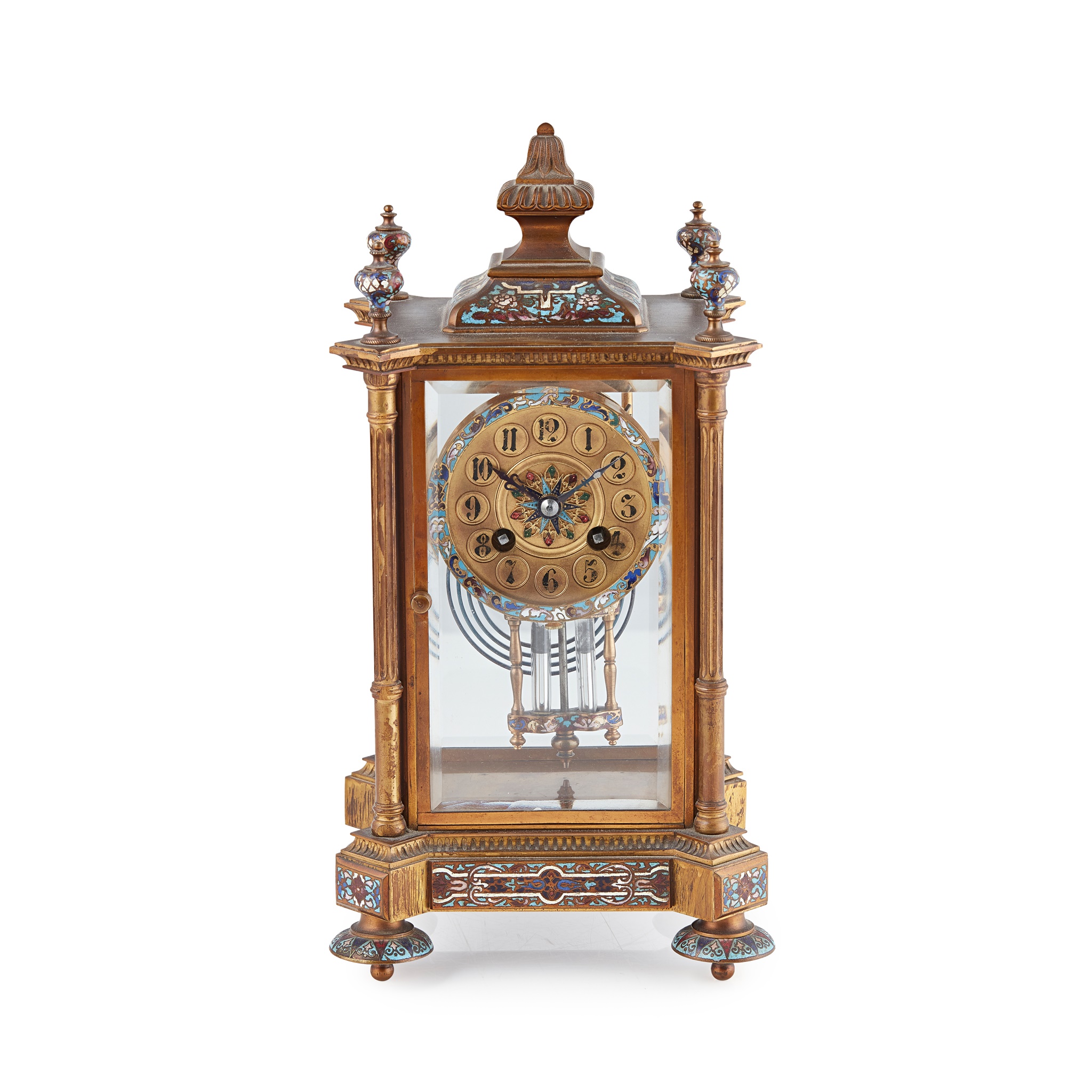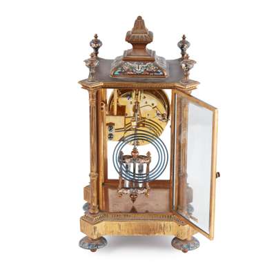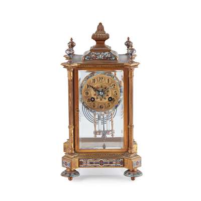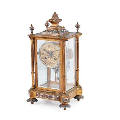 FRENCH GILT BRONZE AND CHAMPLEVÉ ENAMEL FOUR GLASS MANTEL CLOCK