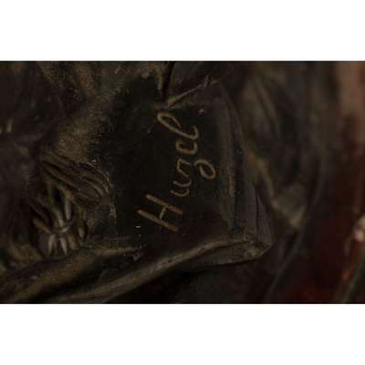 medium brown patina, signed HUZEL [?], on a rouge marble base