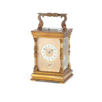 the Arabic numeral dial and subsidiary alarm dial in a matt gilt mask and column case, the movement with gong strike and push button repeat