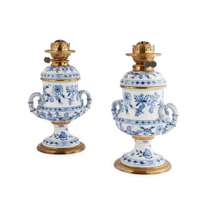 PAIR OF MEISSEN TWIN HANDLED 'ONION' PATTERN OIL LAMPS