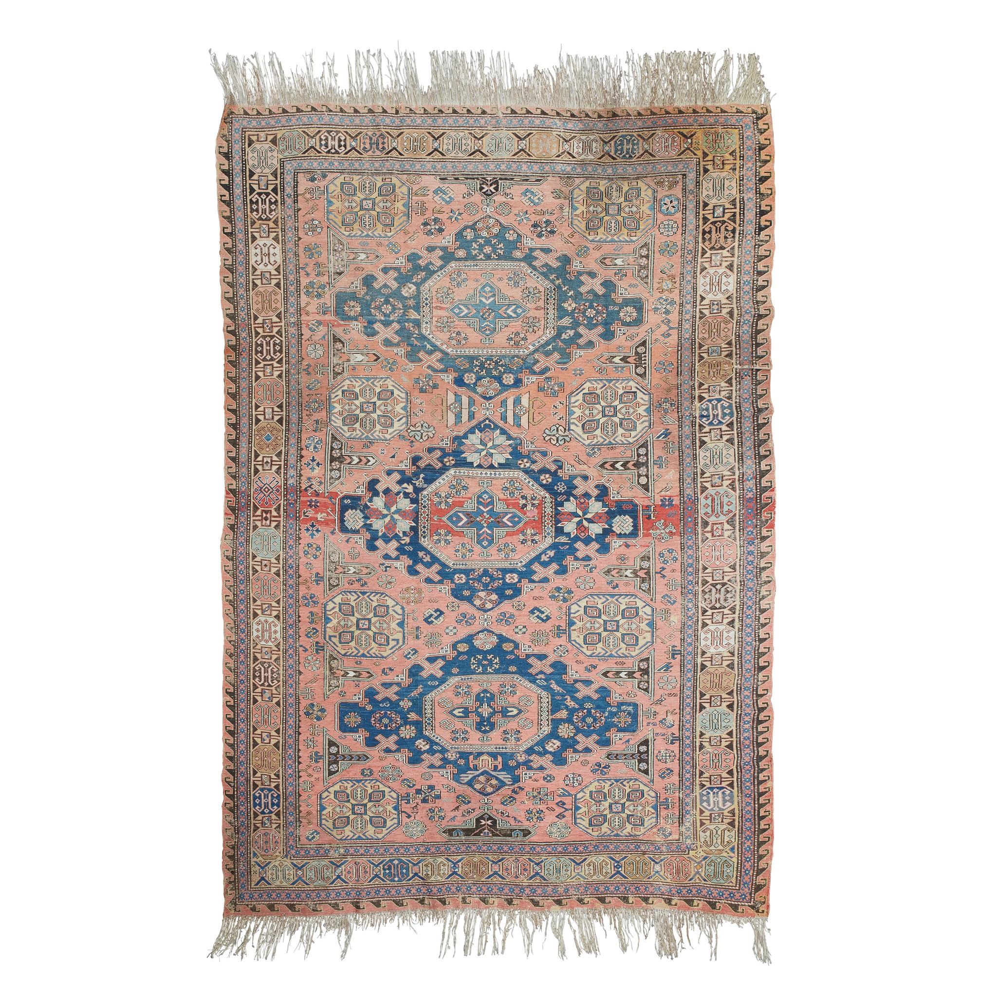 the abrash salmon pink field with three indigo lozenge medallions, within brown geometric border