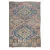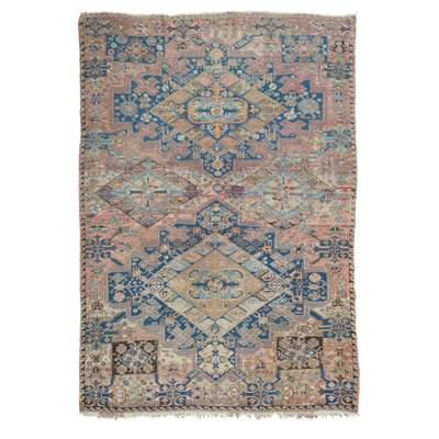the abrash pink and beige field with two large indigo lozenge medallions, within narrow wave scroll band border