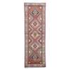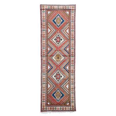 the red field with five indigo and ivory stepped medallions, unpiled panels between, within ivory rosette border