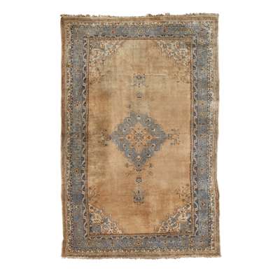 the plain camel field with light blue lozenge medallion, cream spandrels, within light blue geometric vine border