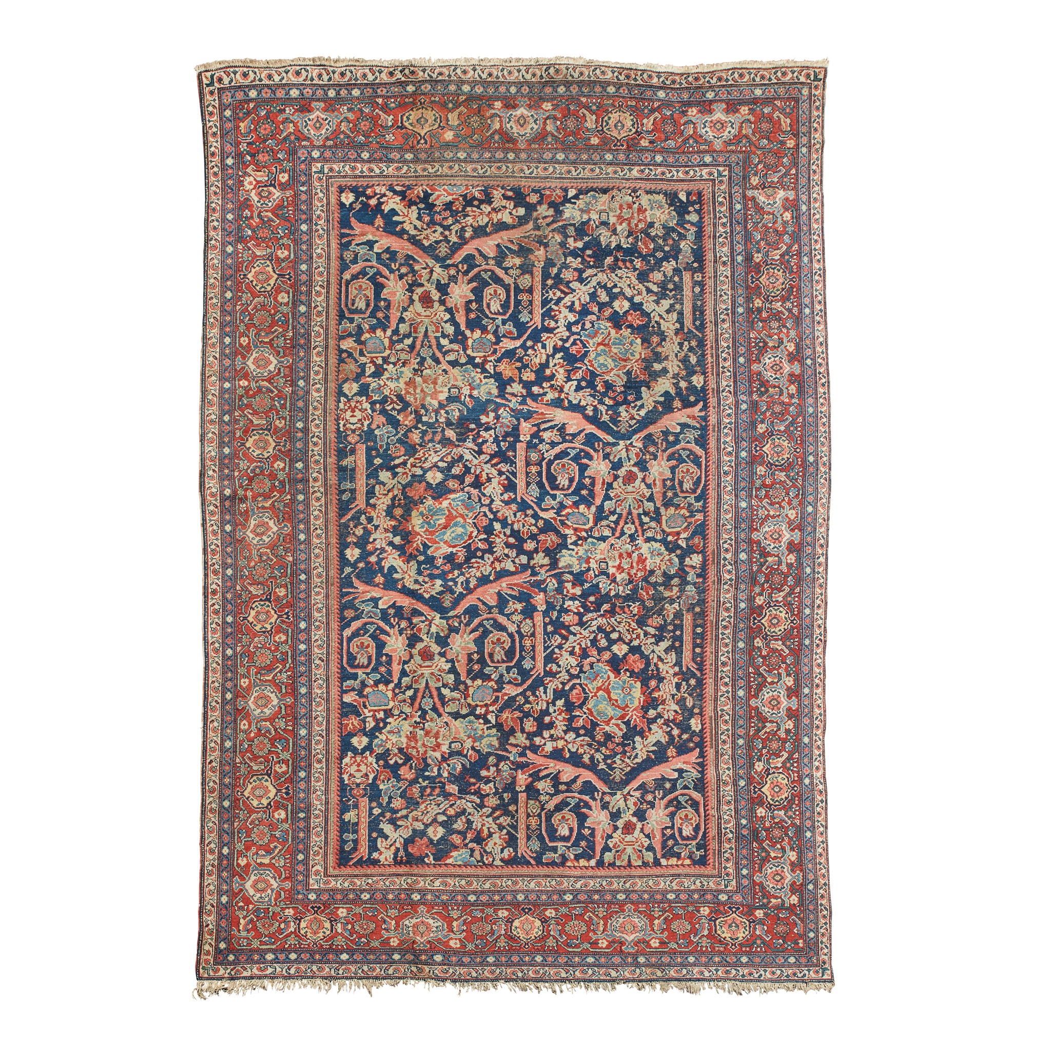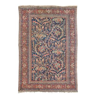 the indigo field with allover stylised foliate 'Mustafavi' pattern, within red turtle palmette and vine border