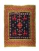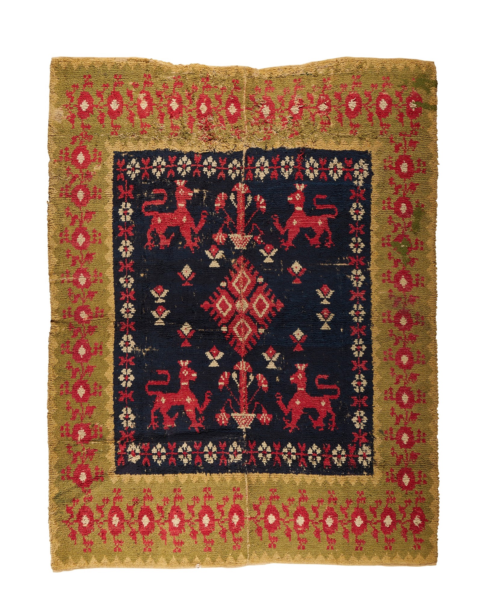 with loop pile in two joined sections, the indigo field with red lozenge medallion flanked by four lions, within green stylised foliate border