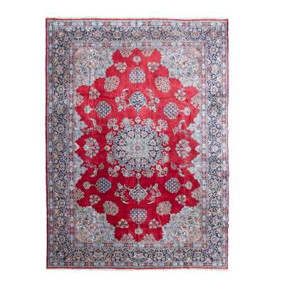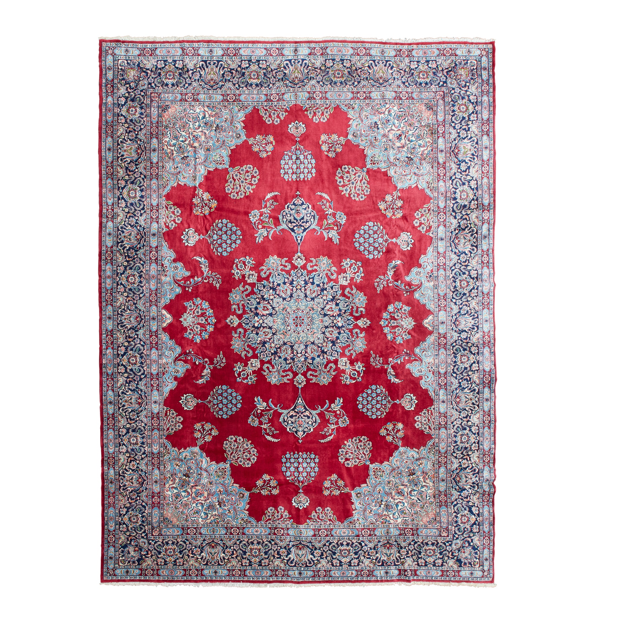 the red field with indigo medallion, blue, ivory and pink spandrels, within indigo palmette and foliate border