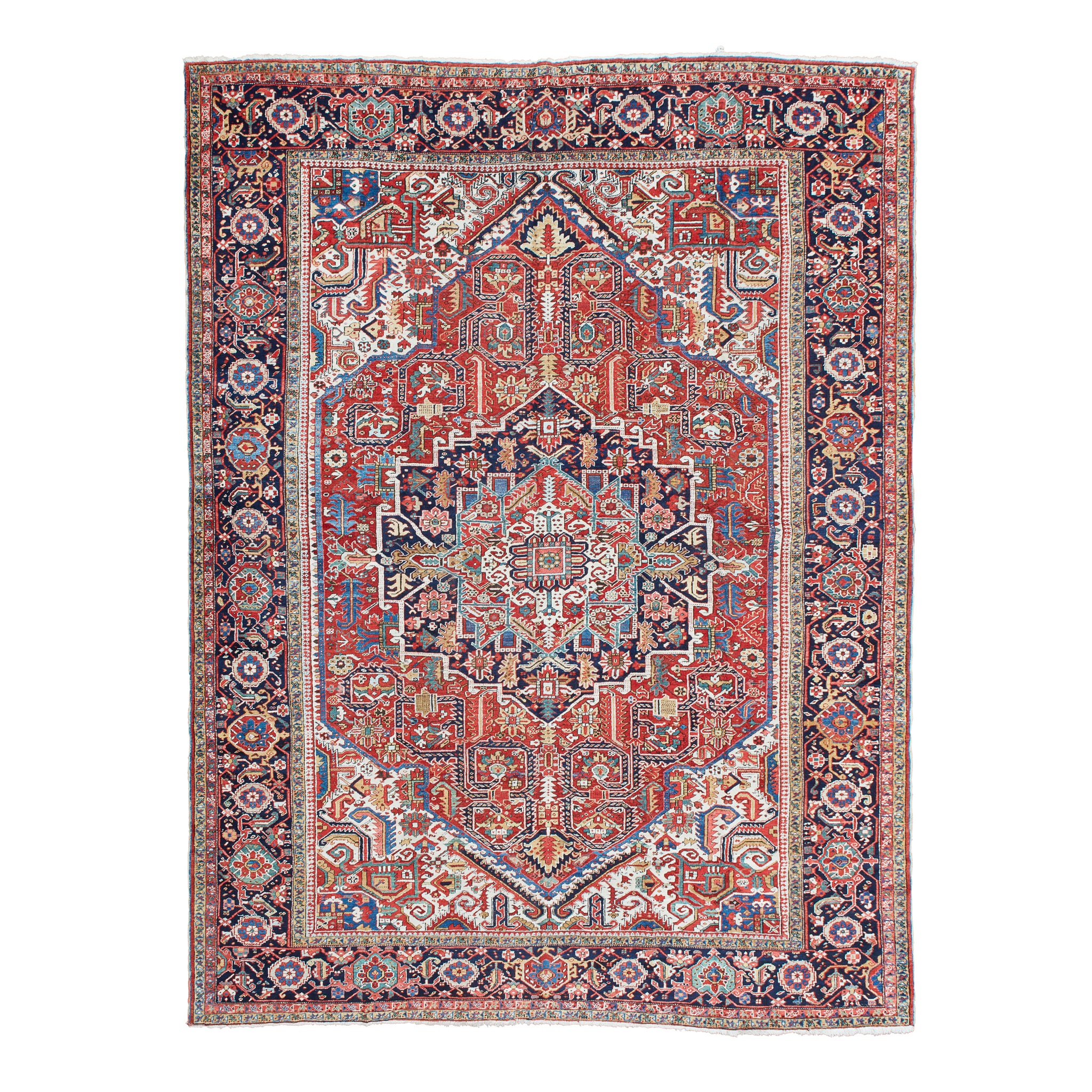 the red field with indigo and ivory medallion, ivory and red spandrels, within indigo rosette, turtle palmette and vine border