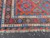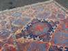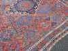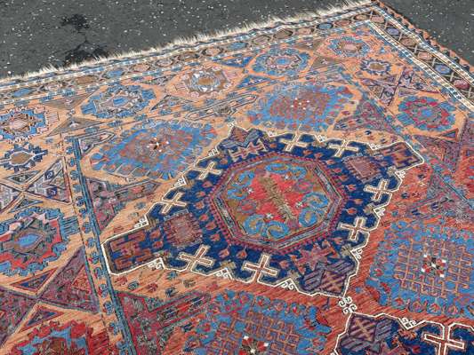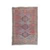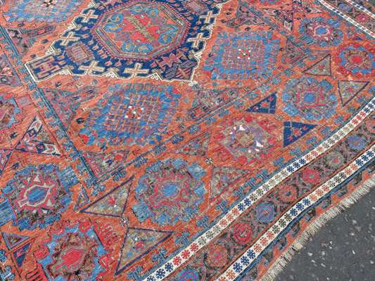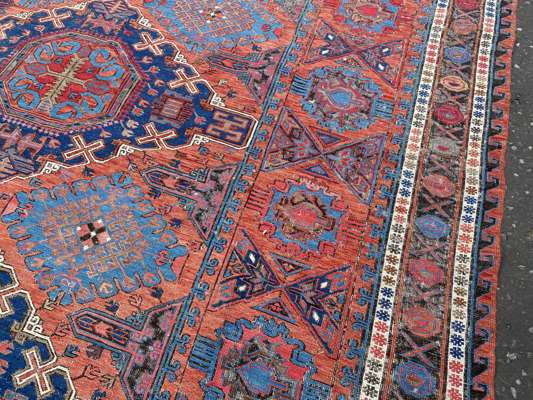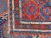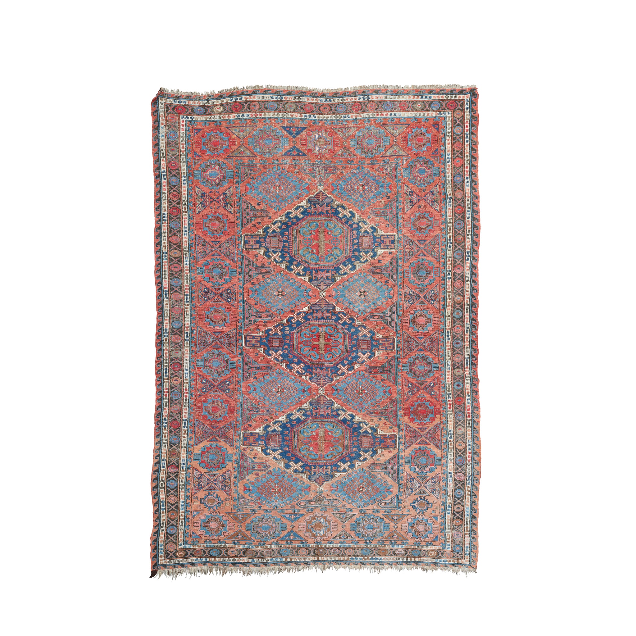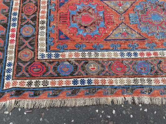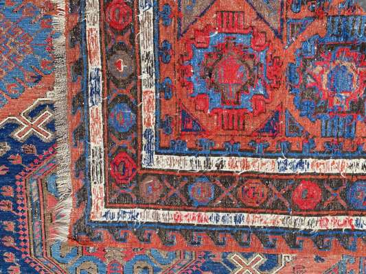 the abrash rust brown field with three indigo lozenge medallions, within narrow brown geometric border