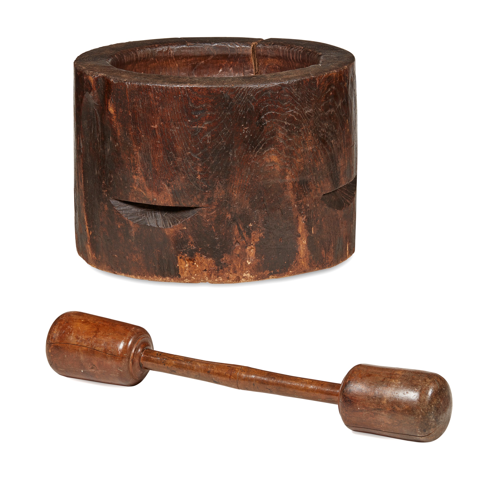 Mortar 69cm diameter, 49cm high; pestle 95cm long