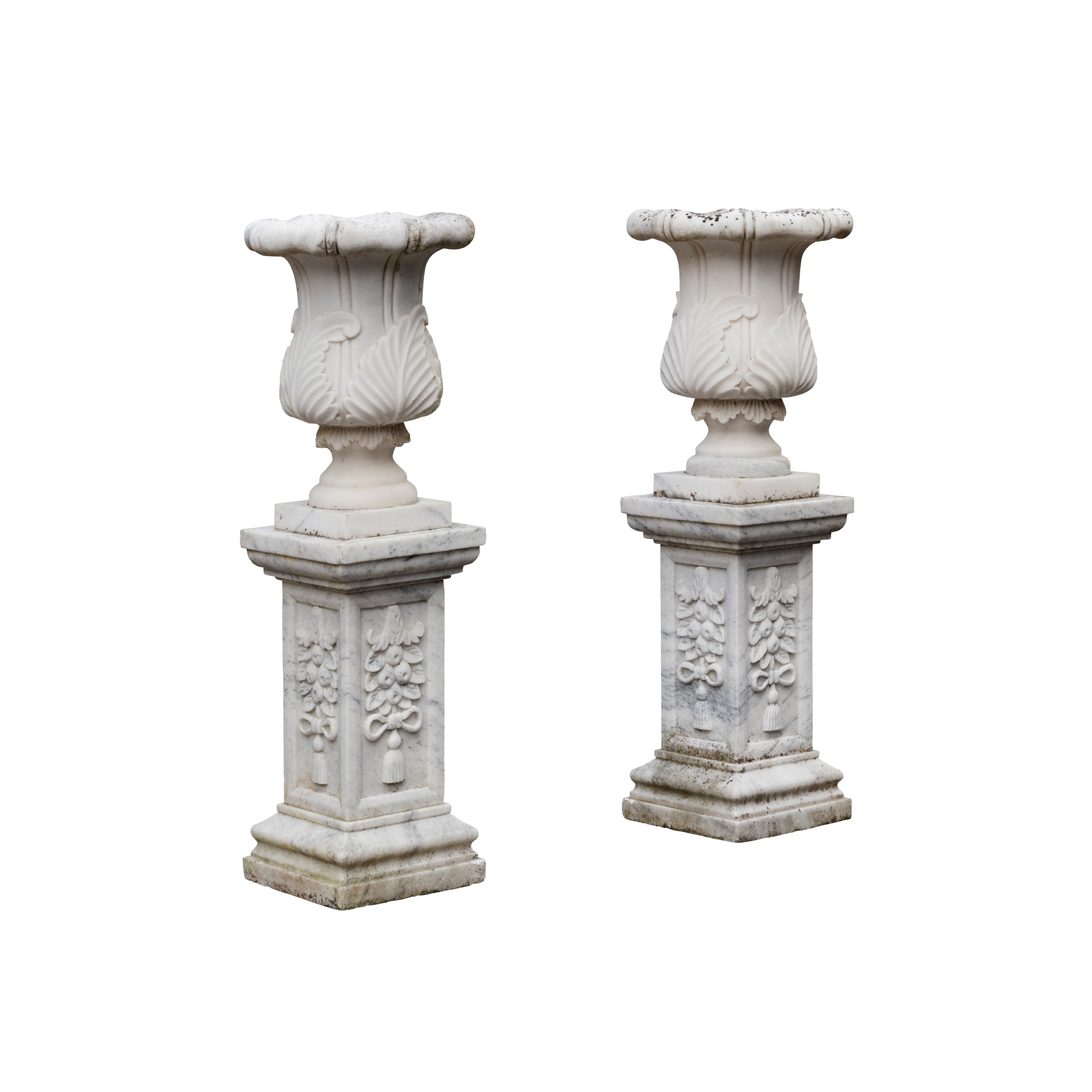 PAIR OF WHITE MARBLE URNS AND STANDS