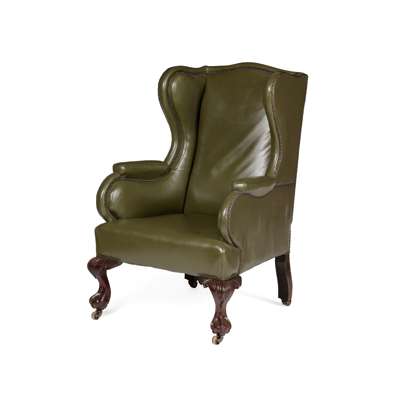 GEORGIAN STYLE MAHOGANY FRAMED GREEN LEATHER WING ARMCHAIR