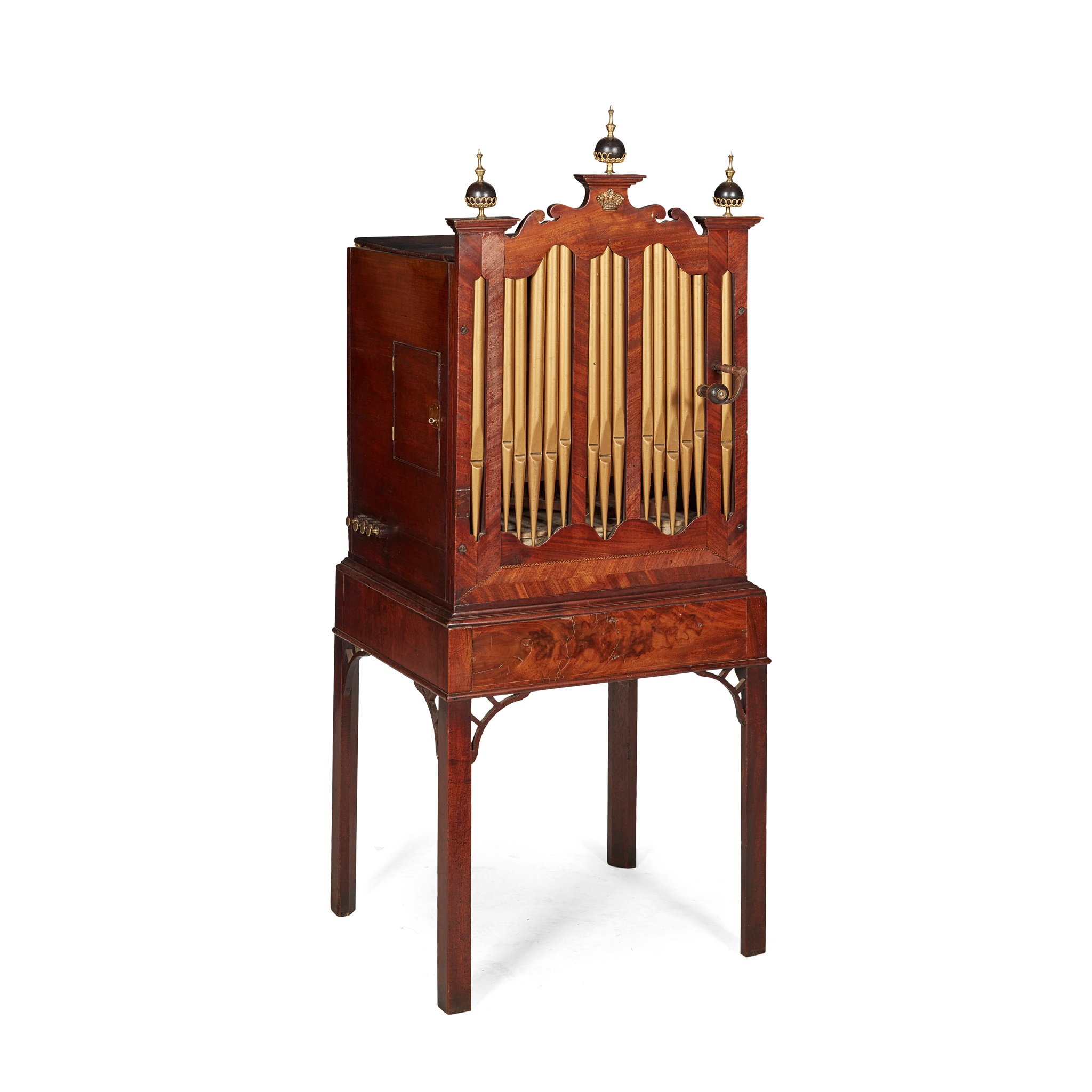 GEORGE III MAHOGANY CASED, PARCEL GILT BARREL ORGAN-ON-STAND