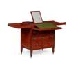 the divided hinged top opening to an arrangement of covered wells, compartments, and a ratchet adjusted mirror