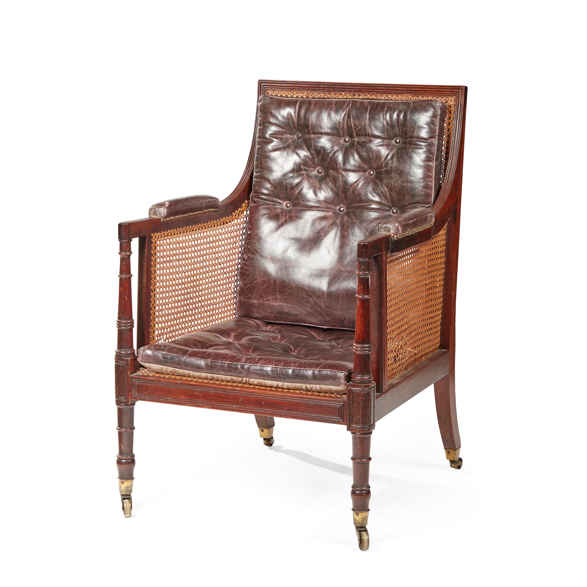 the caned square back and enclosed arms with oxblood leather button-upholstered seat and back cushions and arms pads, on turned legs with brass castors