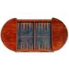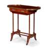 the oval top with a pierced brass gallery and a reversible sliding centre section opening to a chessboard and leather backgammon board, raised on slender turned supports with trestle bases and gilt metal mounts