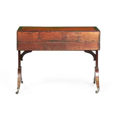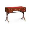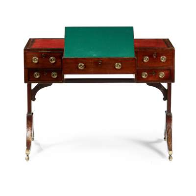 the rectangular top with a red leather insert above a central drawer with an adjustable writing slope, and four short drawers, raised on end supports terminating in splayed legs with brass caps and castors