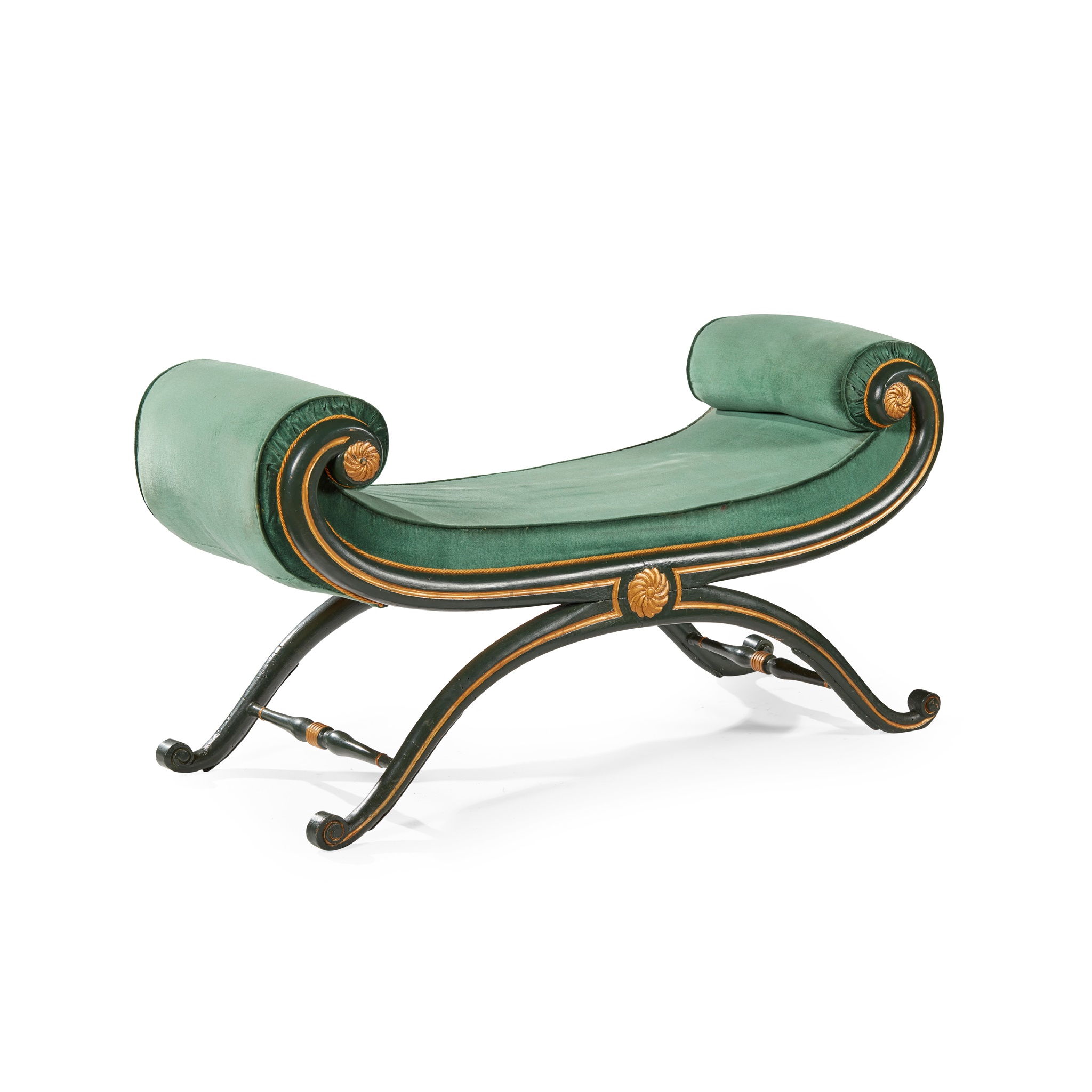 the X-form frame with scrolled ends, painted green with gilt details, covered in dark green plush fabric