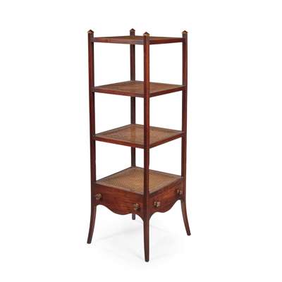 with four caned tiers raised on square reeded supports, the base with a drawer and dummy drawer