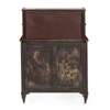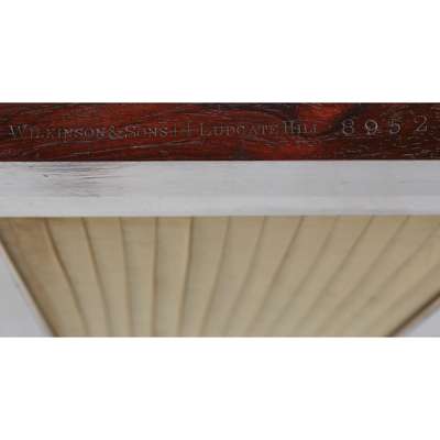 the upper section with two shelves above a base with yellow pleated silk lined doors, on tapered legs with brass castors, stamped on the door WILKINSON & SONS, 14 LUDGATE HILL 8952