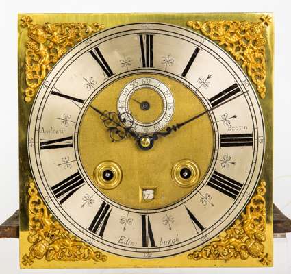Note: Edinburgh made clocks that predate 1700 are exceedingly rare. Andrew Broun [or Brown] (circa 1651-1712) was apprenticed to Humphrey Milne on 2nd February 1665. His apprenticeship was recorded thus "The second day of February 1665. The quilk day, Andro Broun, sone lawfull to umquihil Jon Broun, in Lang Newtone, is booked prentice to Umpra Milne, clock maker." Ten years later he officially ended his apprenticeship after demonstrating his skill to a committee of clockmakers and became a freeman of the Hammermen's Incorporation. He then took on several apprentices and journeymen himself throughout his career. He became Captain of the City Guard in 1685 and Master of the Hammermen's Incorporation in 1689.