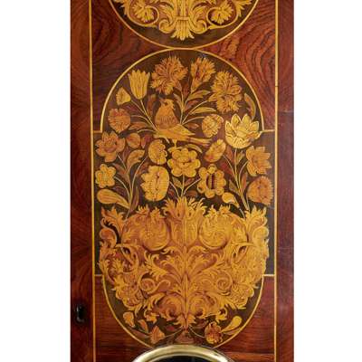 the 12 in. dial with a signed Roman numeral chapter ring, subsidiary seconds dial, date aperture, and twin winding holes, with pierced crown and cherub spandrels; in a caddy hood top with giltwood finials and flanked by ebony columns with giltwood capitals, above a trunk door with a brass banded lenticle and boxwood lined flower and bird marquetry panels; the month-going movement with five pillars and five wheel trains, anchor escapement and bell strike via an outside countwheel