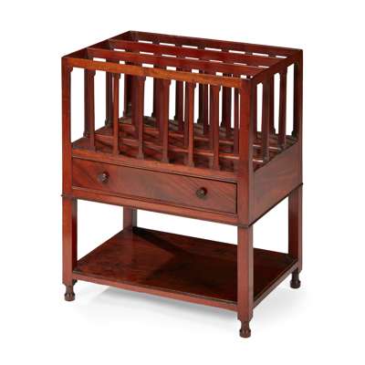with four divisions separated by flat spindles, above a base drawer and undertier, on turned feet
