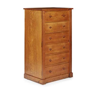 with six drawers and hinged pilasters, one with a Bramah lock, on a plinth base